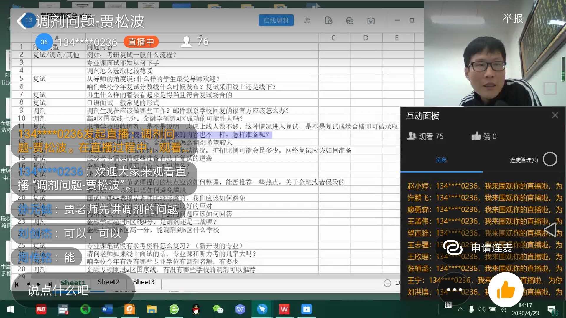 本次线上指导会通过钉钉平台直播进行。贾松波老师结合调查问卷专门对考研复试中专业调剂注意事项、如何完善自己的准备资料、如何发挥出自己的优势等方面与同学们做了详细的讲解。