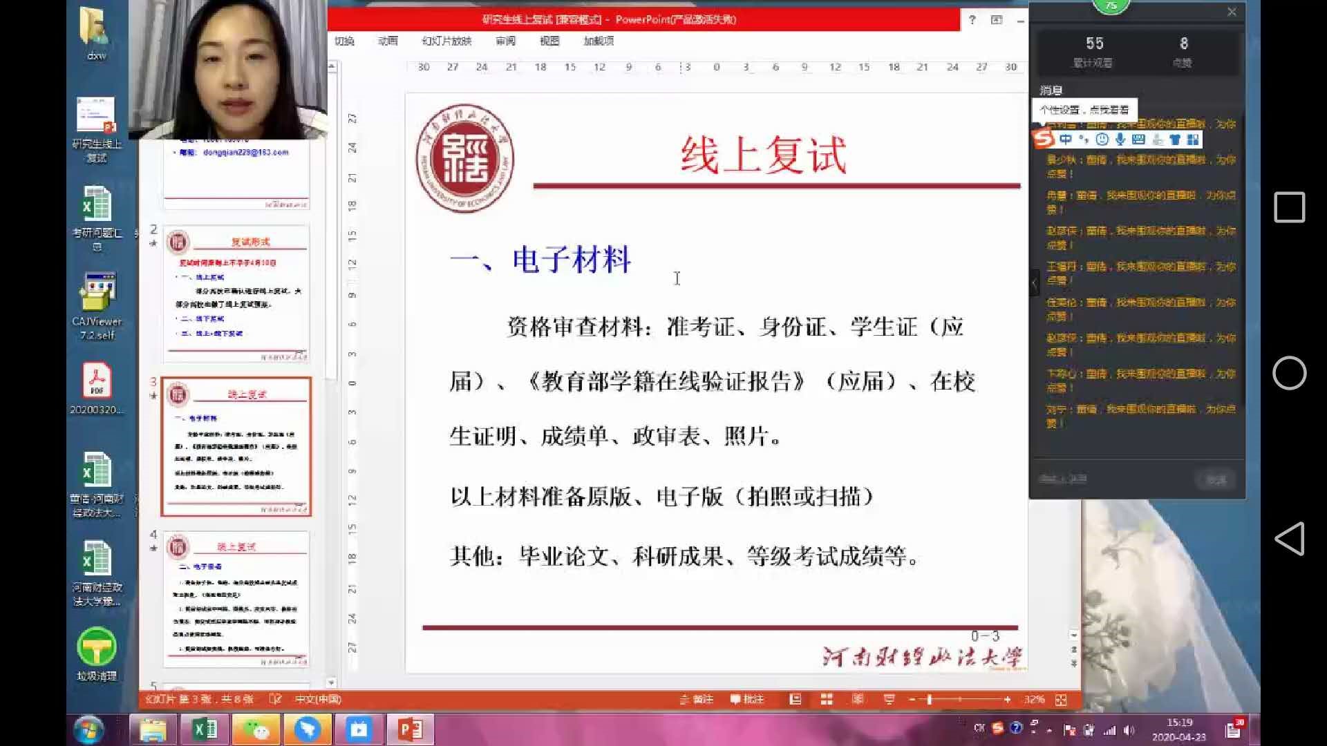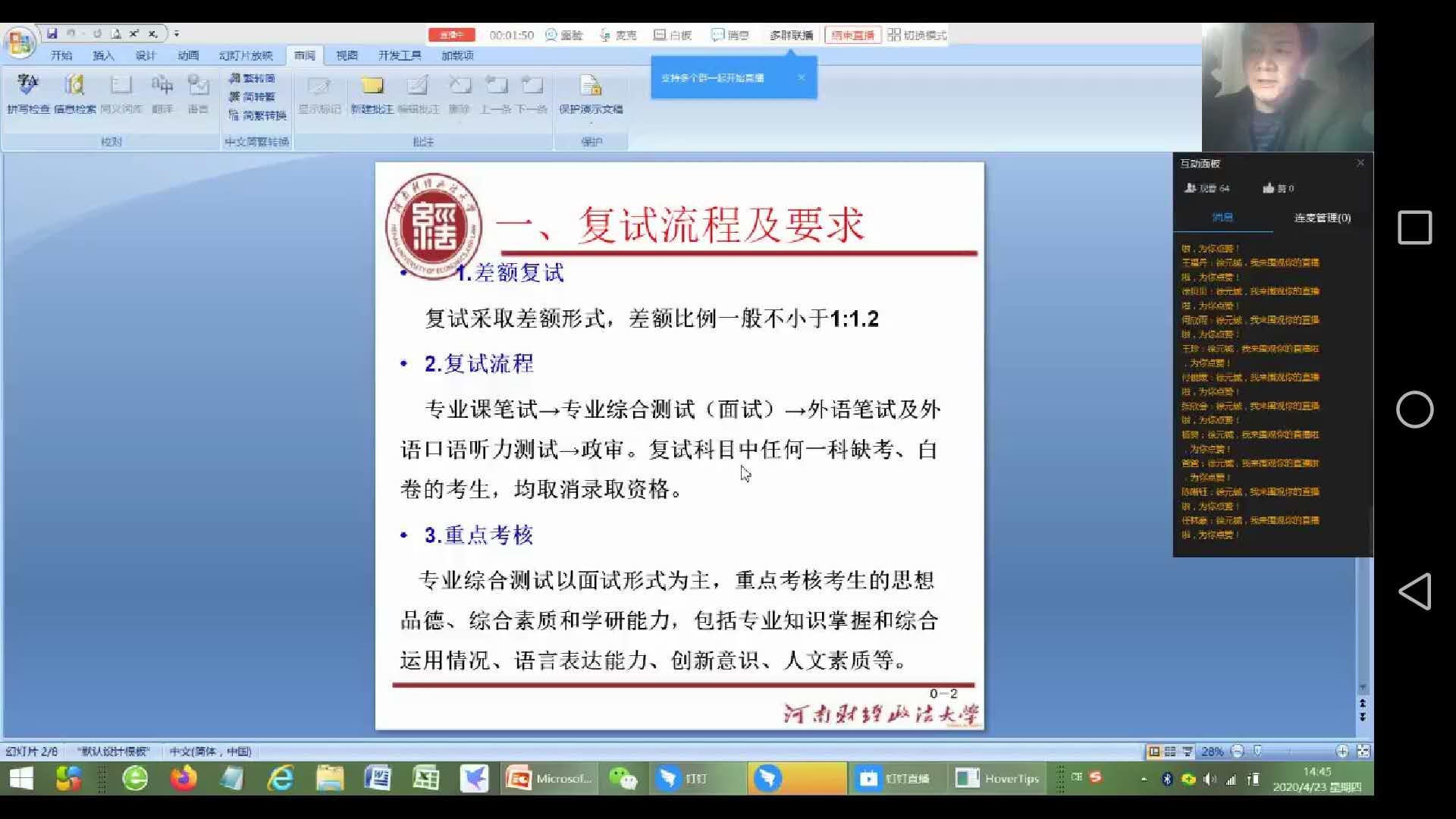 董倩老师针对当前特殊疫情专门向考研学子讲解了线上复试的各项准备工作、模拟演练、心理疏导及注意事项等,并详细回答了员工提出的问题。